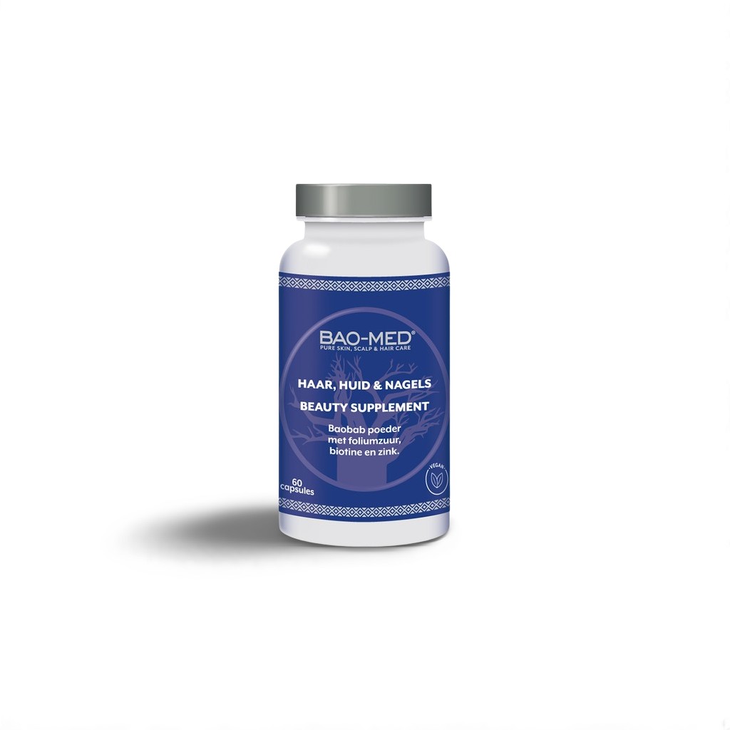 The Mediceuticals Bao-Med Hair, Skin & Nails Food Supplement supports healthy hair growth, radiant skin, and stronger nails with a nutrient-rich blend of vitamins, minerals, and pure baobab oil.